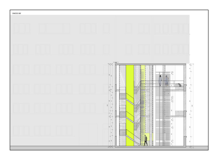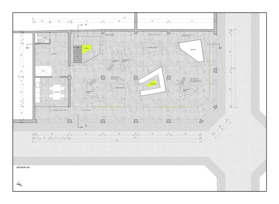 The store itself is located on the ground level. The clothing racks, fitting rooms, the stairs and the counter are all included in the large volumes which represent the buildings in the city. On the first level, you can find an exhibition of the runway collection, where you can walk on the path inbetween the volumes. This path gives you a great view over the whole store.