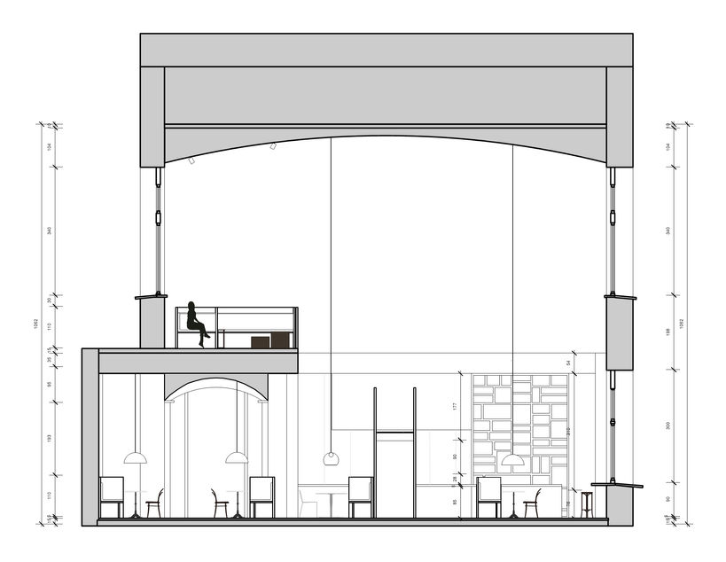 In the contemporary part concrete and stainless steel are used to give the space a minimalist and clean look. In the old bistro styled area, the original elements of this ancient building are kept such as the tile floor and the vaults. These elements give the space an authentic character and form the connection with the rest of the building.